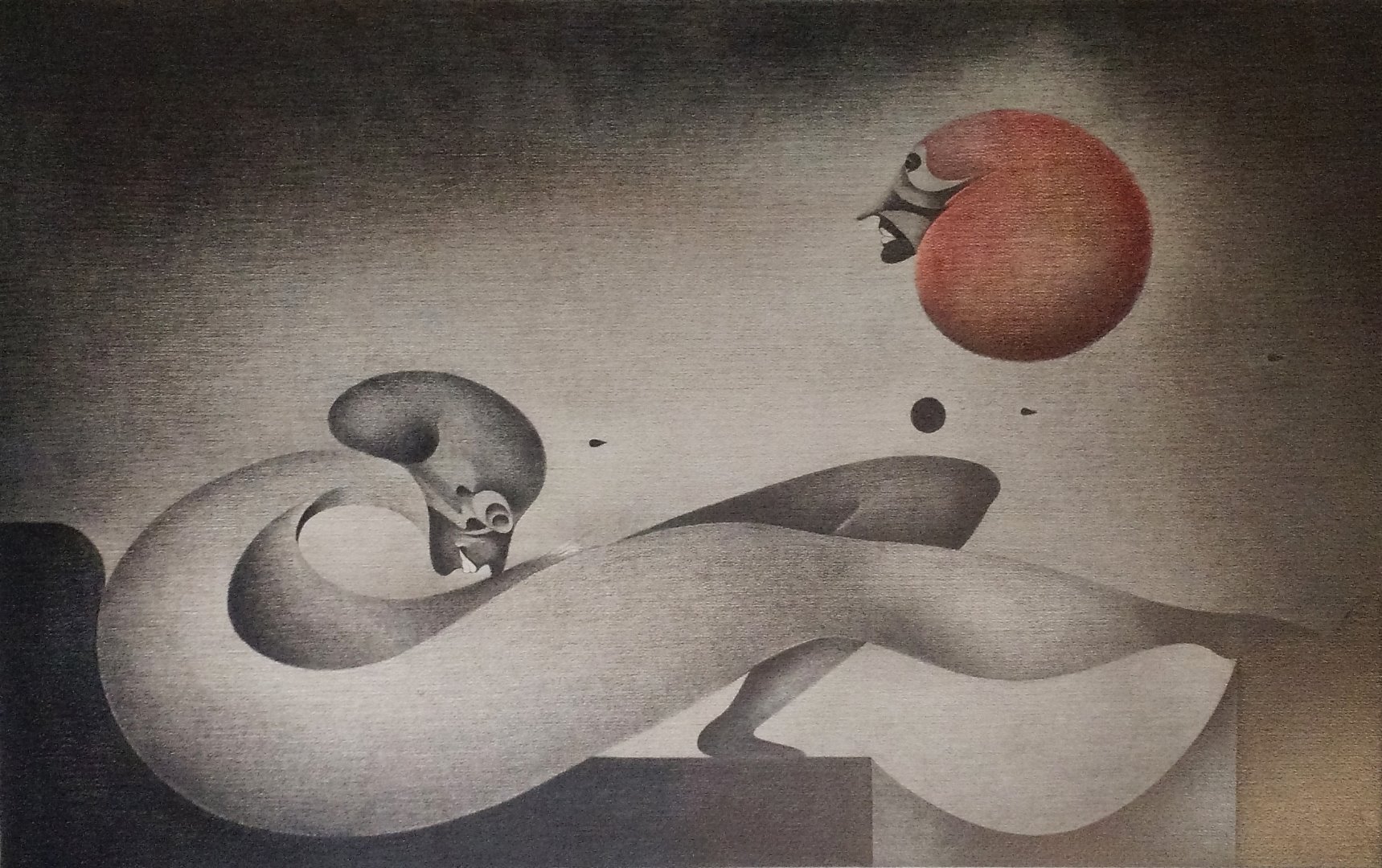 Working with my assistant Sae Kimura, opening up one portfolio after another of his drawings and looking at them exposed, not even under glass, we were struck by his incredible skill and patience. It is at first glance impossible to take in the fine and subtle layers of what emerges as incredible animated figures exhibiting particular human qualities or gestures. Actually it is the complexity of the characters he draws which is most striking and unusual. None are simply this or that. Rather each one embodies a whole range of human emotions as each of us do. But remarkably he does not seem to pass judgement on or favour one quality over another. Perhaps this is what enables us to look more closely and to inquire into his unique perception. And when we do look we see that his figures are moving, even when they appear to be still they are fluid. Often they are balanced very tentatively on balls or on the edge of stairs and this conveys a dynamic energy in the pieces, for the most part, speaking of his drawings, without the use of colour.